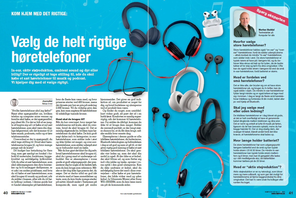 Lyd Vælg de helt rigtige høretelefoner In-ear, aktiv støjreduktion, ambient sound og dyr eller billig? Der er rigeligt at tage stilling til, når du skal købe et sæt høretelefoner til musik og podcast. Vi hjælper dig med at vælge rigtigt.