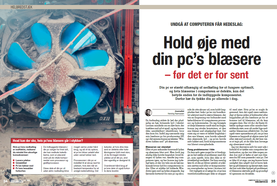 Computer Hold øje med din pc’s blæsere - før det er for sent Din pc er stærkt afhængig af nedkøling for at fungere optimalt, og hvis blæserne i computeren er defekte, kan det betyde enden for de indbyggede komponenter. Derfor bør du tjekke din pc allerede i dag.