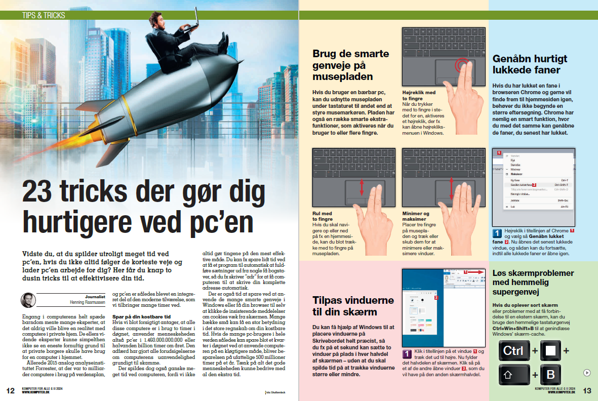 Computer 23 tricks der gør dig hurtigere ved pc’en Vidste du, at du spilder utroligt meget tid ved pc’en, hvis du ikke altid følger de korteste veje og lader pc’en arbejde for dig? Her får du knap to dusin tricks til at effektivisere din tid.