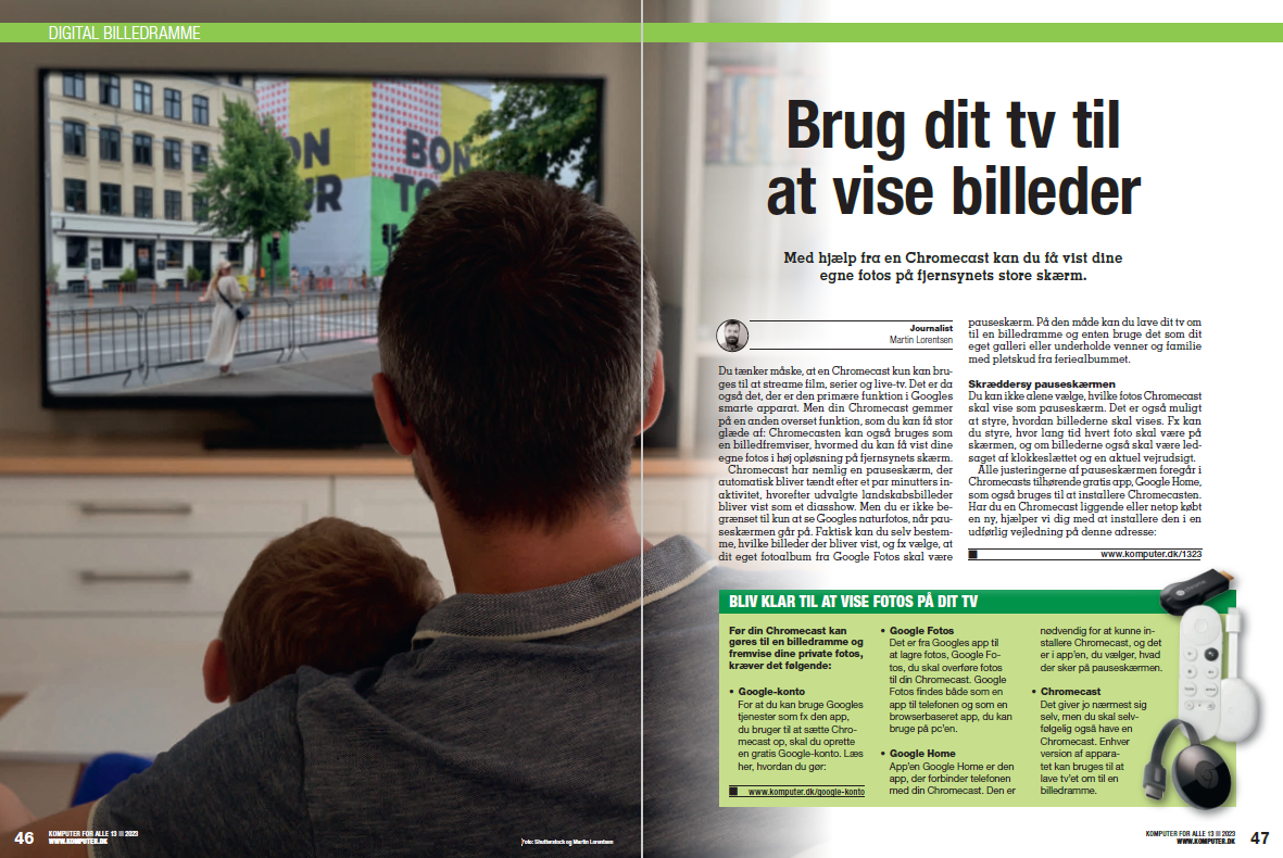 TV Brug dit tv til at vise billeder Med hjælp fra en Chromecast kan du få vist dine egne fotos på fjernsynets store skærm.