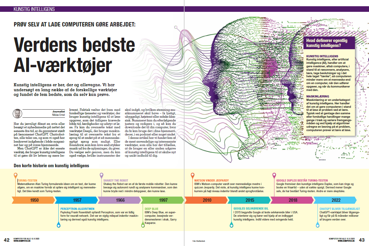 Computer Verdens bedste AI-værktøjer Kunstig intelligens er her, der og allevegne. Vi har undersøgt en lang række af de forskellige værktøjer og fundet de fem bedste, som du selv kan prøve.