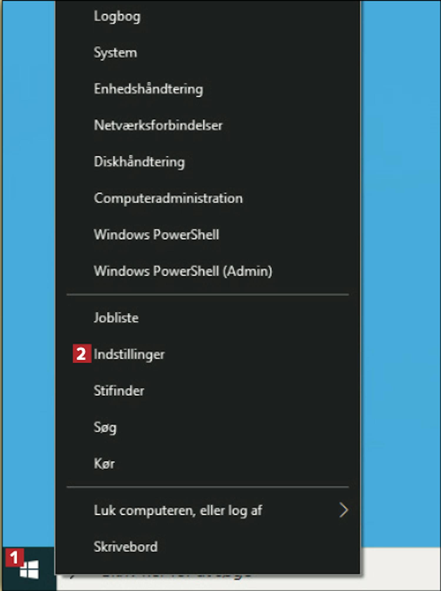 Start med at højreklikke på startknappen 1 i Windows, og vælg så Indstillinger 2 .