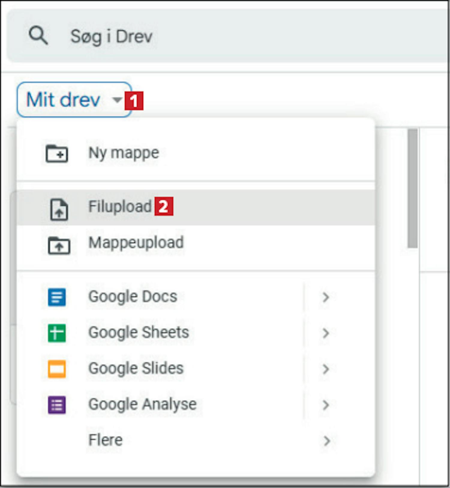 Klik på Mit drev 1 i toppen af Google Drev, og klik dernæst på Filupload 2 .