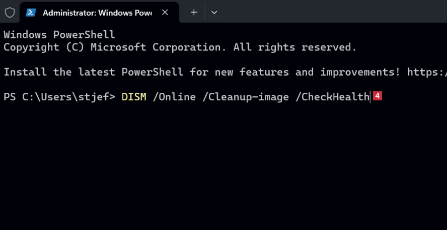 Skriv DISM /Online /Cleanup-Image /CheckHealth 4 (der skal være et mellemrum før hver skråstreg), og tast Enter. Vent igen, til scanningen er afsluttet.