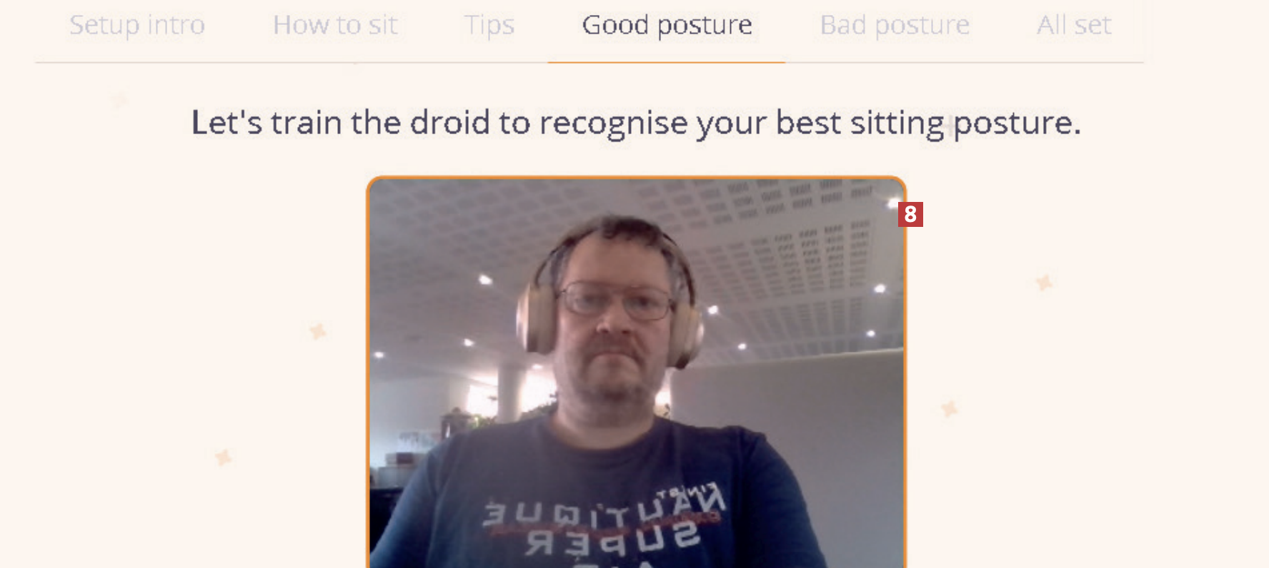 Billedet fra dit webkamera bliver nu vist i feltet 8. Du skal demonstrere din gode siddestilling for programmet. Ret dig op, og sørg for, at dit hoved vises i øverste halvdel af rammen.