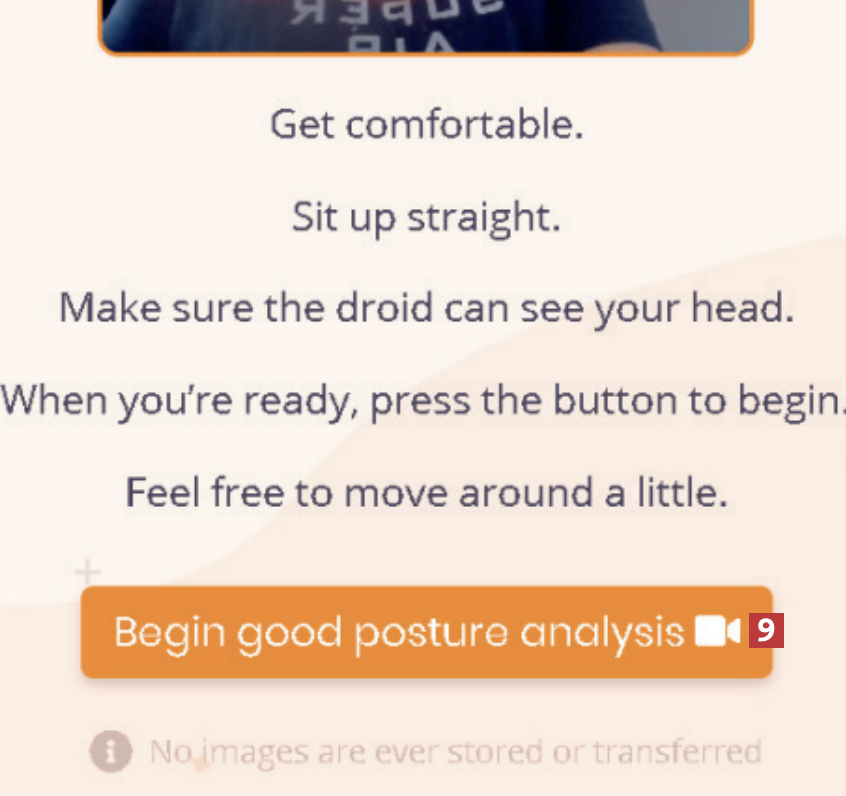 Klik på Begin good posture analysis 9. Dermed går kameraets analyse af din gode siddestilling i gang.