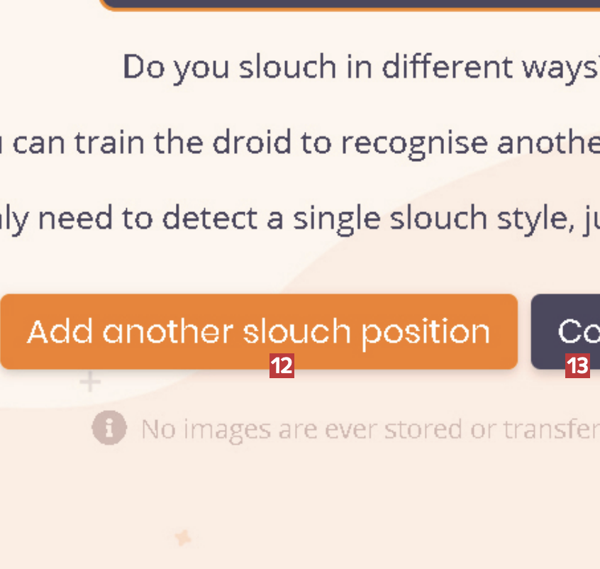 Efter målingen kan du vise programmet endnu en dårlig stilling med Add another slouch position 12. Afslut optræningen ved at klikke på knappen Continue 13.