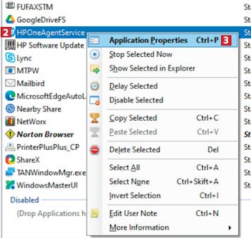 Højreklik nu på et program, du ikke ønsker skal starte sammen med Windows 2 og vælg Application Properties 3 .