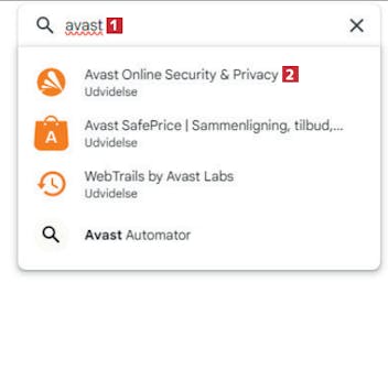 Åbn din Chrome-browser og besøg adressen chromewebstore.google.com. Skriv Avast 1 i søgefeltet og klik på Avast Online Security & Privacy 2 .