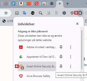 Du kan indstille udvidelsen eller se statistik over dens brug ved at klikke på udvidelsesikonet i værktøjslinjen 5 og derefter vælge Avast Online Security 6 .