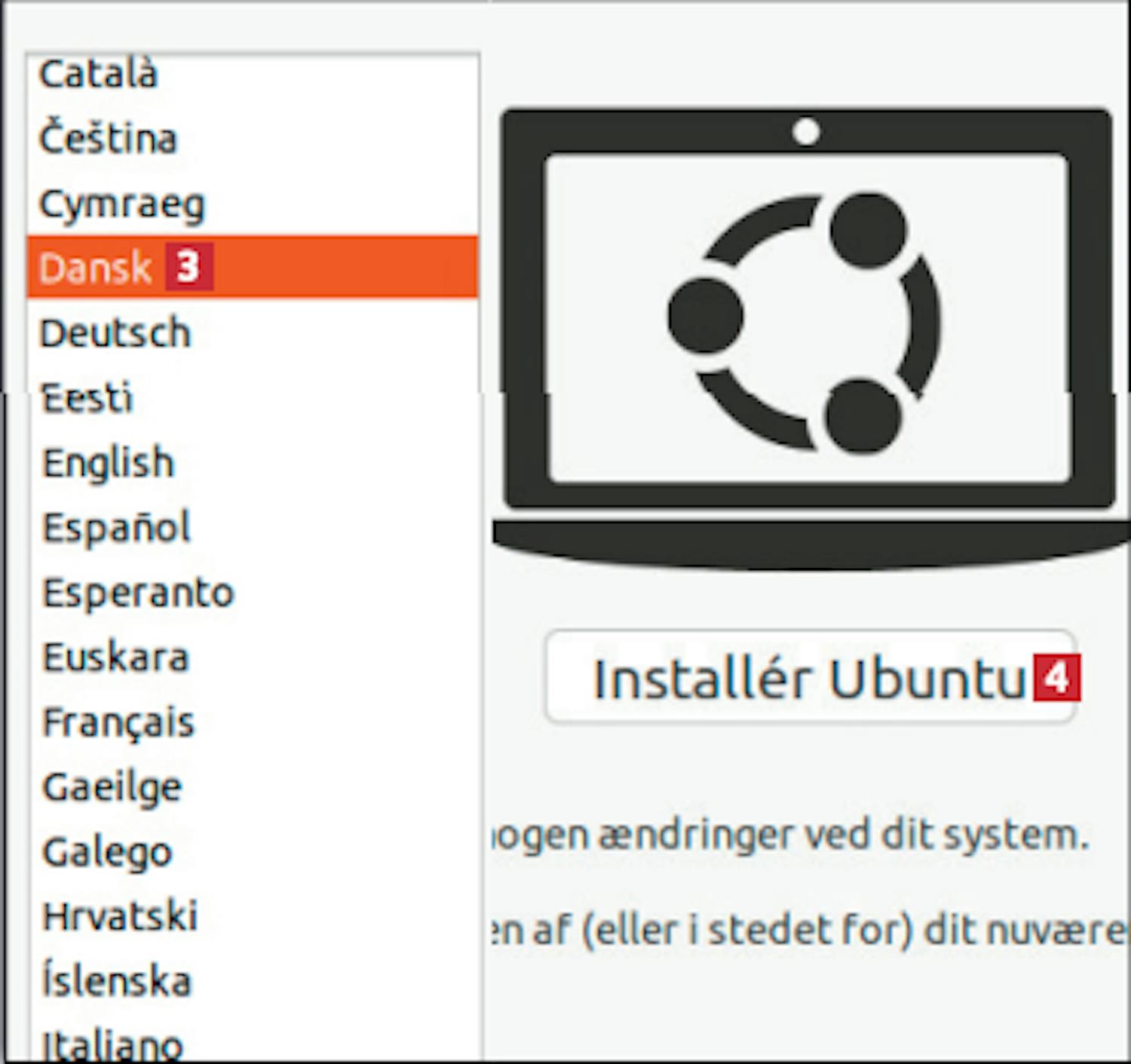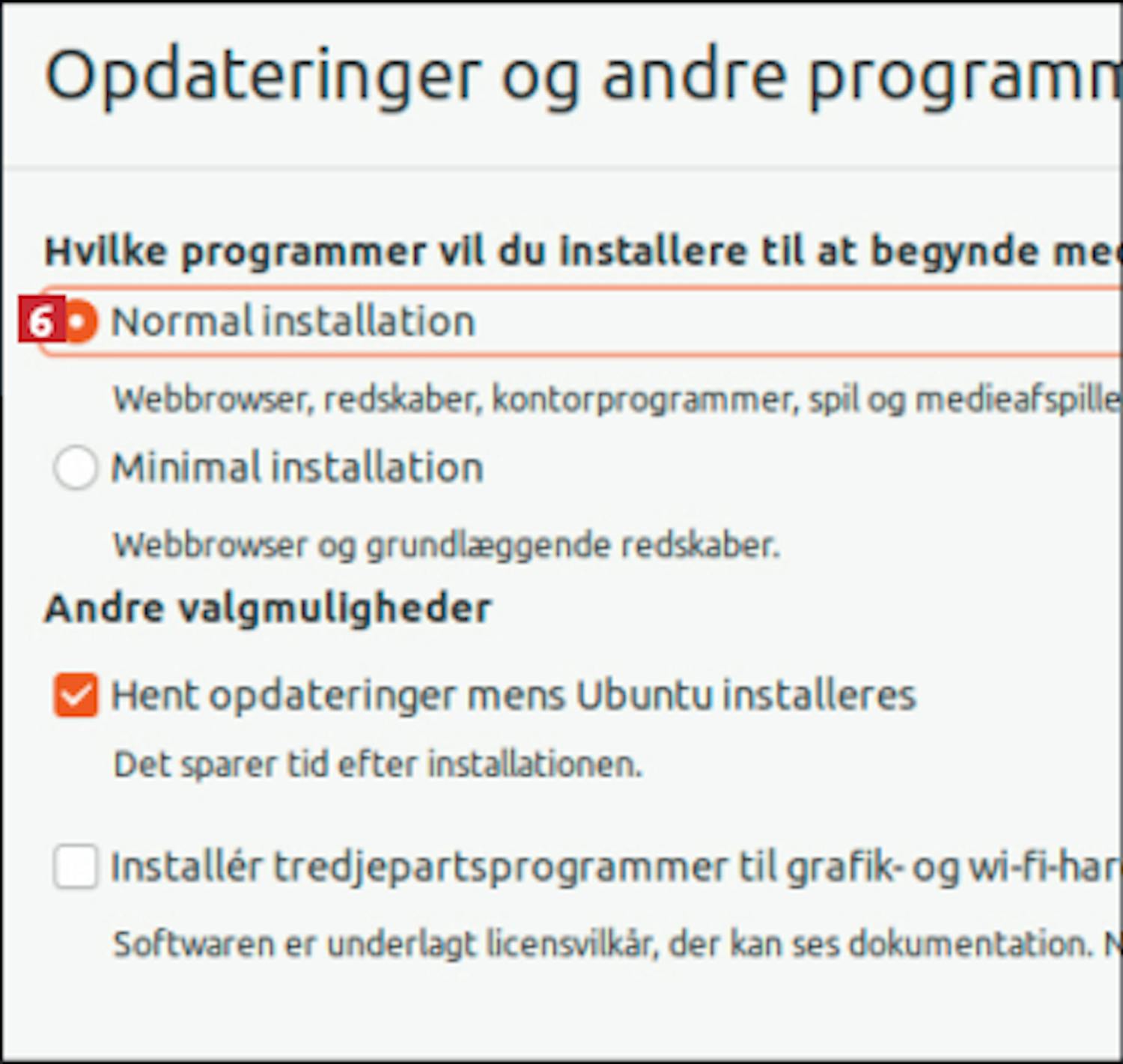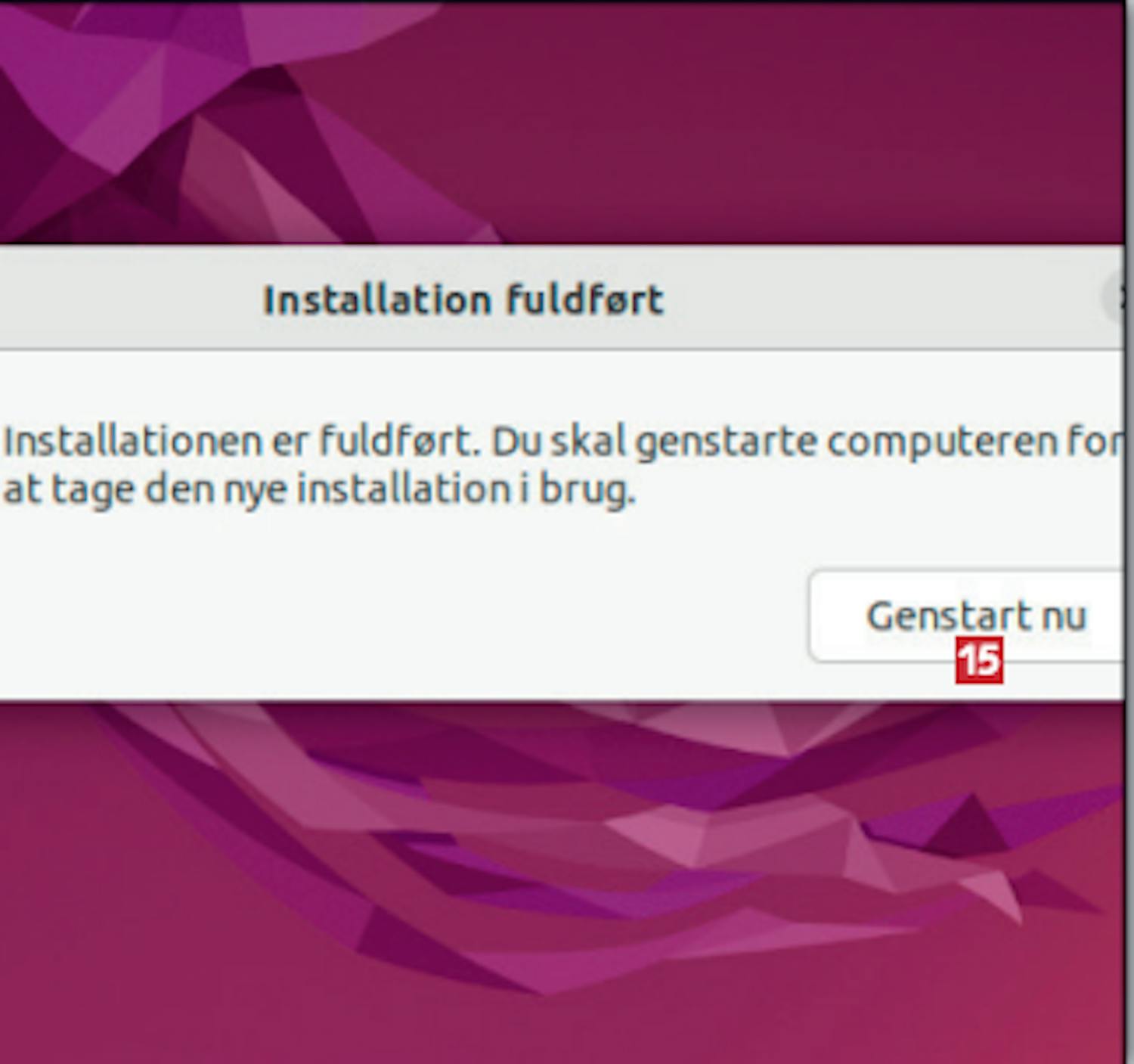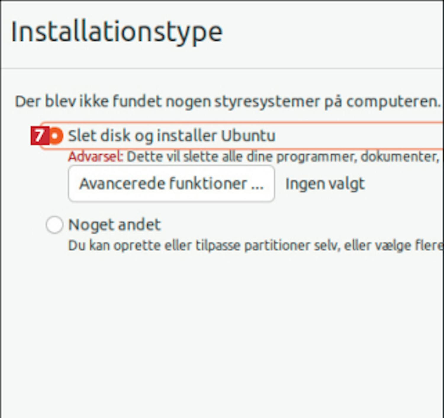 Nu er du klar til at lægge Ubuntu ind på din pc i stedet for Windows. Du skal derfor tilslutte USBnøglen, som vi oprettede lige før, til pc’ens USB-port og starte computeren. Vær opmærksom på, at installationen sletter alt på din harddisk.