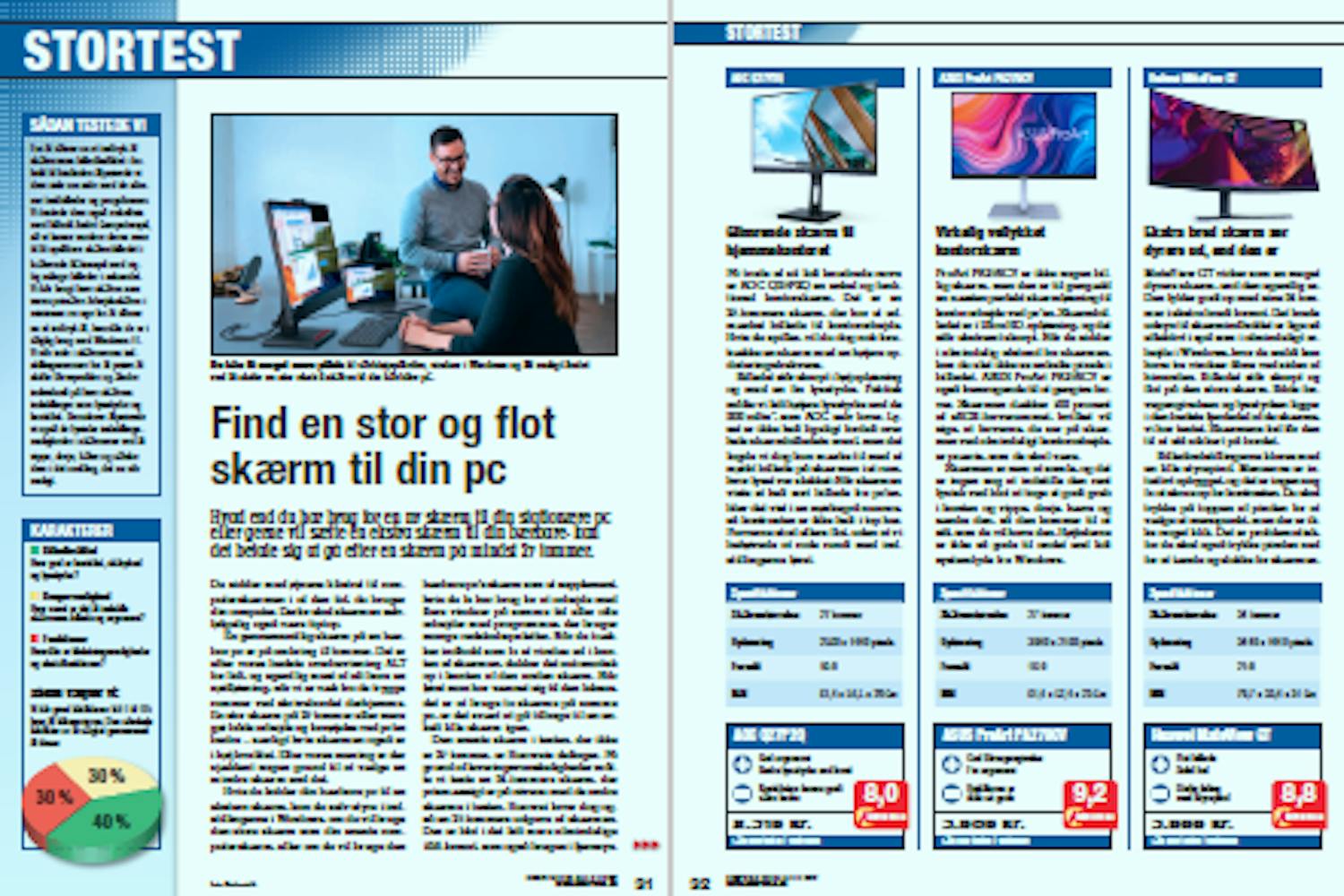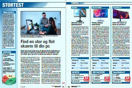 Når du trækker indhold som fx et vindue ud i kanten af skærmen, dukker det automatisk op i kanten af den anden skærm. Når først man har vænnet sig til den luksus, det er at bruge to skærme på samme pc, er det svært at gå tilbage til en enkelt lille skærm igen. Den eneste skærm i testen, der ikke er 27 tommer, er Huaweis deltager. På grund af leveringsvanskeligheder måtte vi teste en 34-tommers skærm, der prismæssigt er på niveau med de andre skærme i testen. Huawei laver dog også en 27-tommers udgave af skærmen. Den er blot i det lidt mere almindelige 16:9-format, som også bruges i fjernsyn.