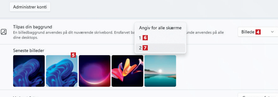 Jeg har to skærme sluttet til min stationære pc med Windows 11. Jeg kunne godt tænke mig, at skærmene viste hver sin baggrund i stedet for den samme. Er det muligt, eller er jeg nødt til at se på samme billede på begge skærme?
