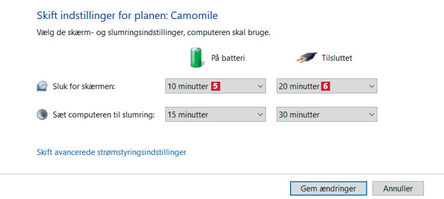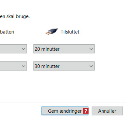 Du er nu fremme ved skærm- og slumringsindstillingerne. I rullemenuerne angiver du et tidsrum for både På batteri 5 og Tilsluttet 6. Hos os slukker skærmen altså først efter 10 minutter, når den er på batteri, og efter et 20 minutter, når den er tilsluttet strøm.