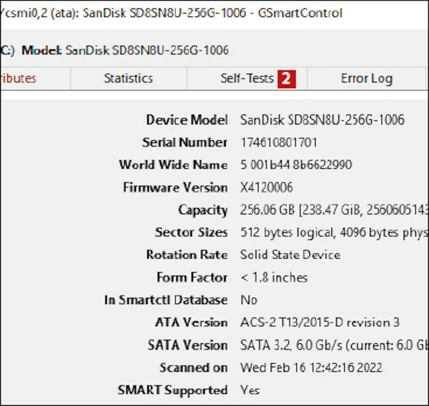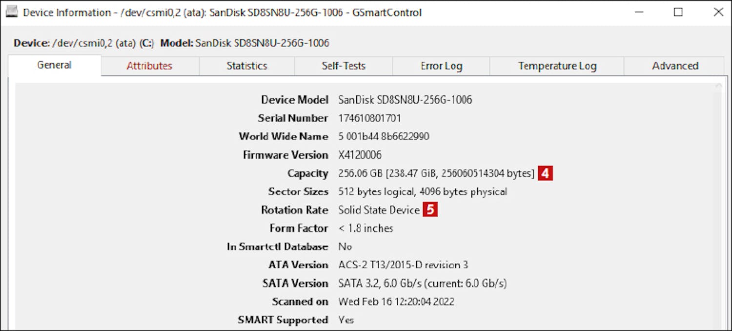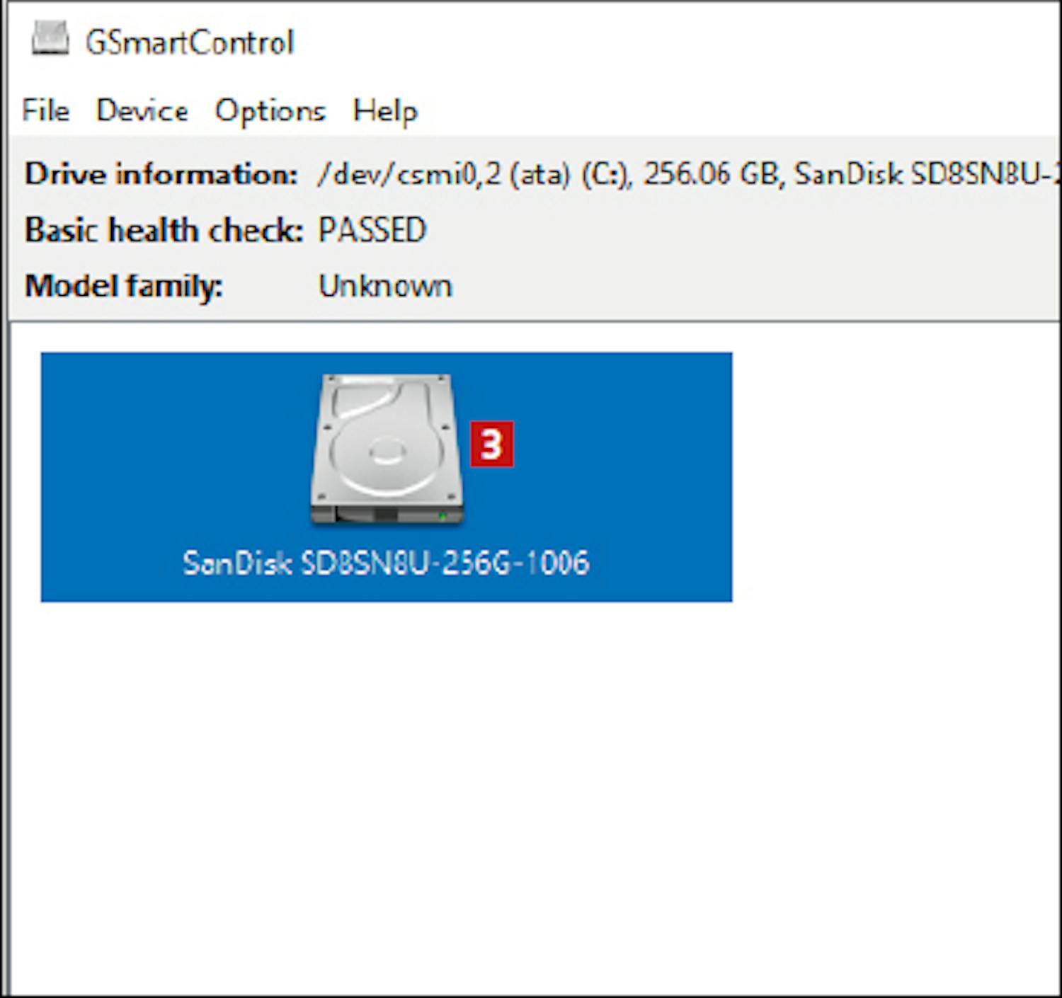 Når du undersøger harddisken for fejl, viser GSmartControl dig først en kort analyse af den harddisk, du har valgt at undersøge. I analysen kan du blandt andet få et overblik over harddiskens kapacitet, og hvorvidt den har bestået det indledende helbredstjek.