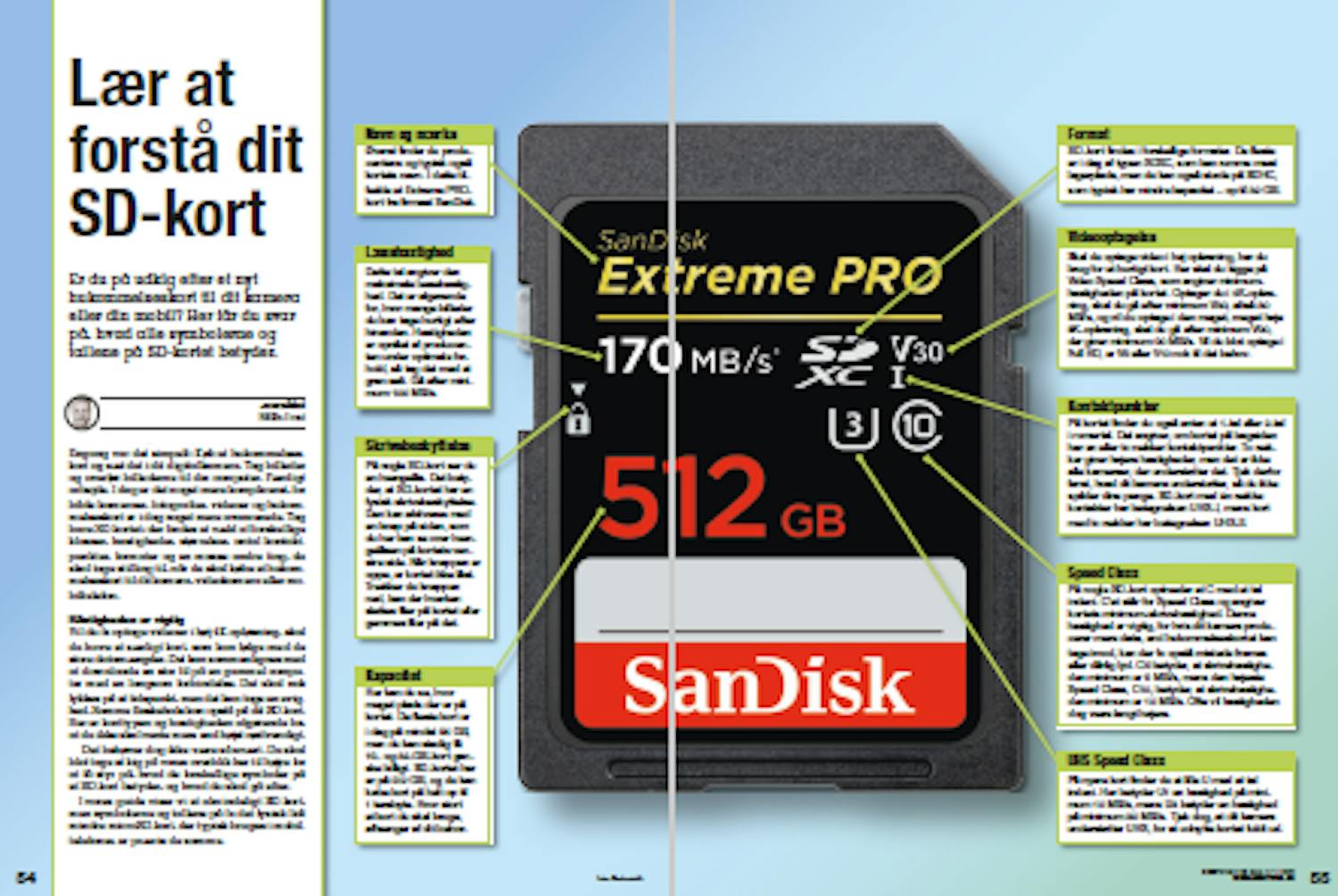 Samme flaskehals kan opstå på dit SD-kort. Her er korttypen og hastigheden afgørende for, at du ikke skal vente mere end højst nødvendigt. Det behøver dog ikke være så svært. Du skal blot tage et kig på vores overblik her til højre for at få styr på, hvad de forskellige symboler på et SD-kort betyder, og hvad du skal gå efter. I vores guide viser vi et almindeligt SD-kort, men symbolerne og tallene på fx det fysisk lidt mindre microSD-kort, der typisk bruges i mobiltelefoner, er præcis de samme.