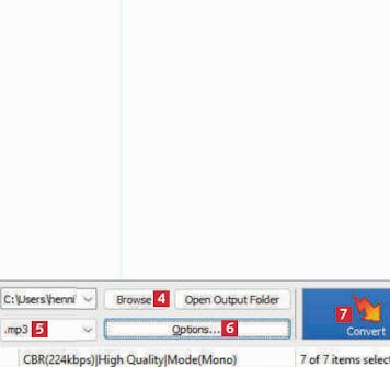 Klik på Browse 4 og vælg, hvor filerne skal gemmes. Vælg .mp3 5. Kvaliteten er sat til 224 kbps, men det kan du ændre ved at klikke på Options… 6. Klik på Convert 7.