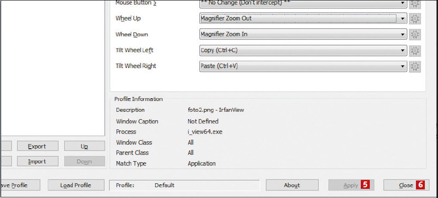 Her viser vi et konkret eksempel på, hvordan du kan bruge X-Mouse Button Control. Vi ønsker, at musens knapper optimeres til fotoprogrammet IrfanView. I den gule boks herunder har vi forklaret nogle af de nyttige funktioner, du kan vælge i rullemenuerne.