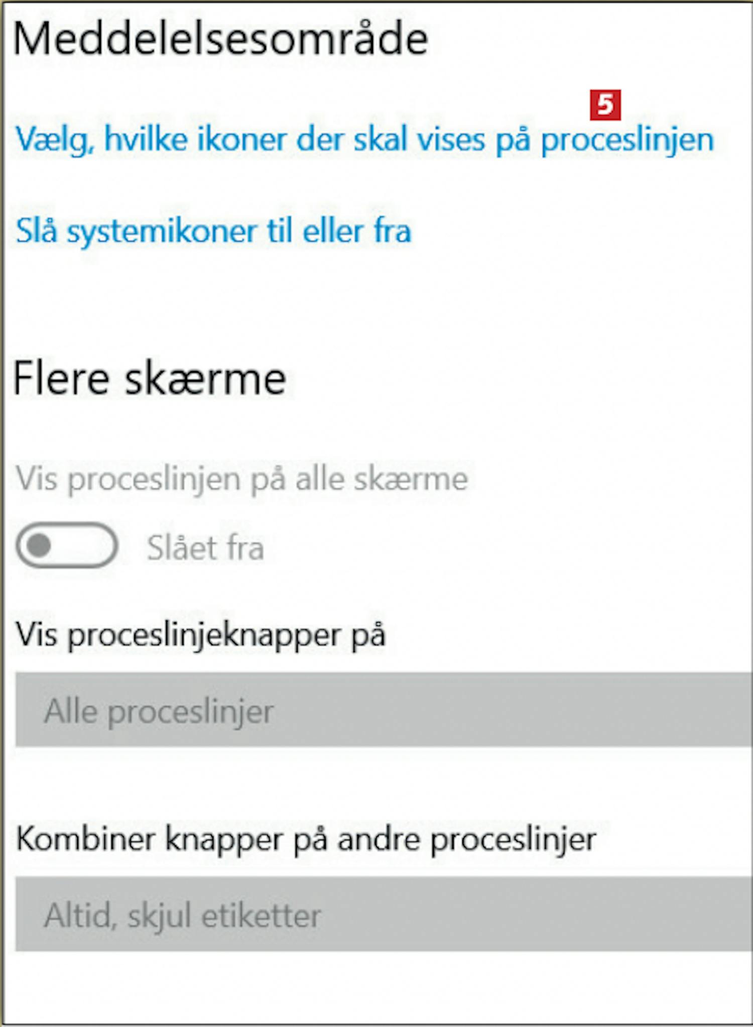 Under Meddelelsesområde vælger du Vælg, hvilke ikoner der skal vises på proceslinjen 5 .
