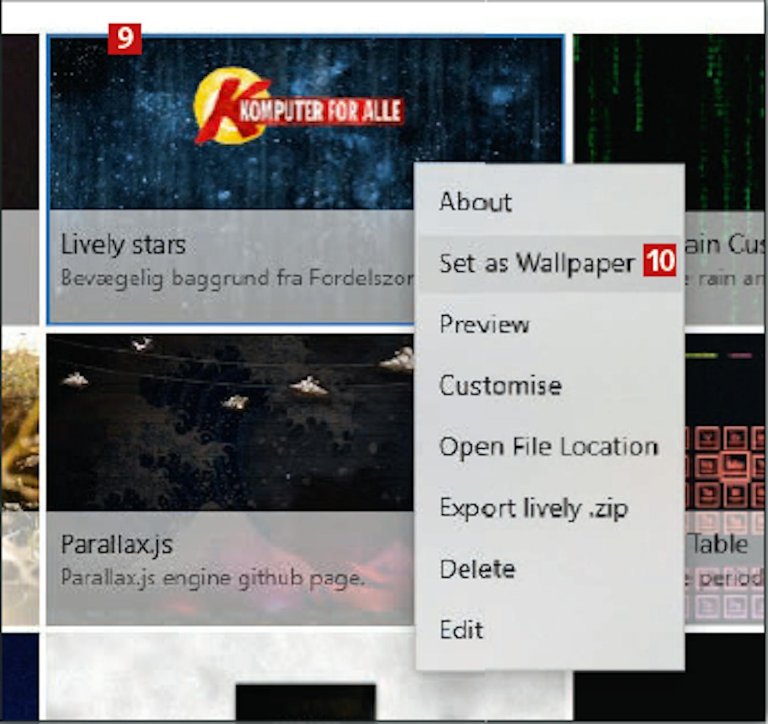 Når du installerer programmet Lively Wallpaper, ligger der straks en række flotte bevægelige baggrunde klar til dig. Det kræver blot et klik – så er baggrunden på dit Skrivebord blevet levende.