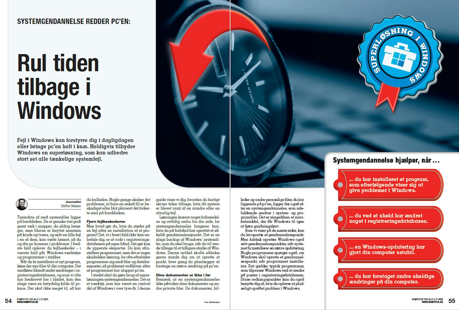 I denne guide viser vi dig, hvordan du hurtigt skruer tiden tilbage, hvis dit system er blevet ramt af en mindre eller en alvorlig fejl. Løsningen kræver noget forberedelse og rettidig omhu fra din side, for systemgendannelse fungerer kun, hvis du på forhånd har oprettet et såkaldt gendannelsespunkt. Det er en slags backup af Windows’ systemfiler, som du skal bruge, når du vil vende tilbage til et tidligere stadie af Windows. Denne artikel skulle således gerne minde dig om at oprette et punkt, hver gang du planlægger at foretage en større ændring på pc’en.