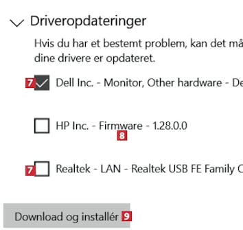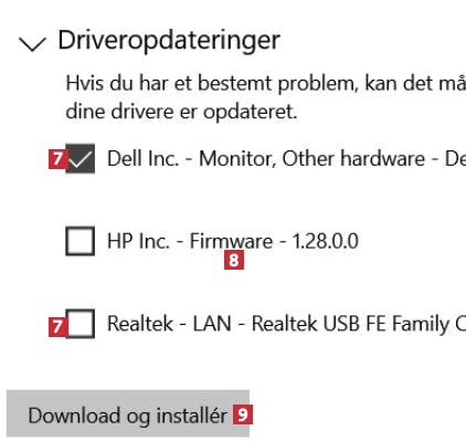 Markér de drivere, du ønsker at opdatere 7 , men lad være med at vælge BIOS eller firmware 8, da det kan give dig tekniske problemer. Klik på Download og installér 9.