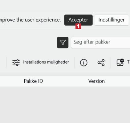 Til at begynde med skal du hente UniGetUI fra vores hjemmeside. Installér programmet og åbn det. Derefter klikker du på Accepter 1.
