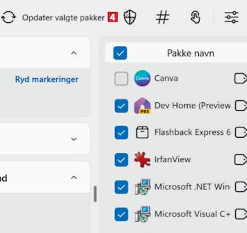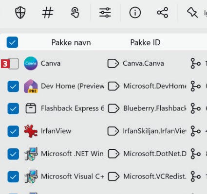 En liste med opdateringer vises. Hvis du ønsker at bevare en bestemt ældre udgave af et program, fjerner du blot markeringen 3 ved programmet.