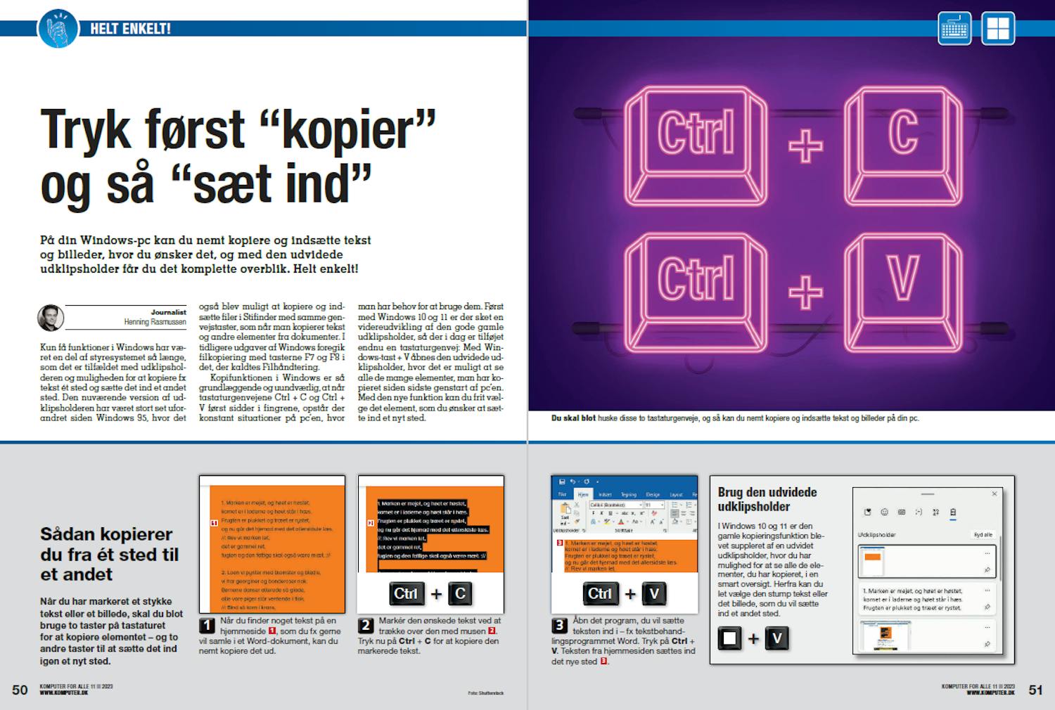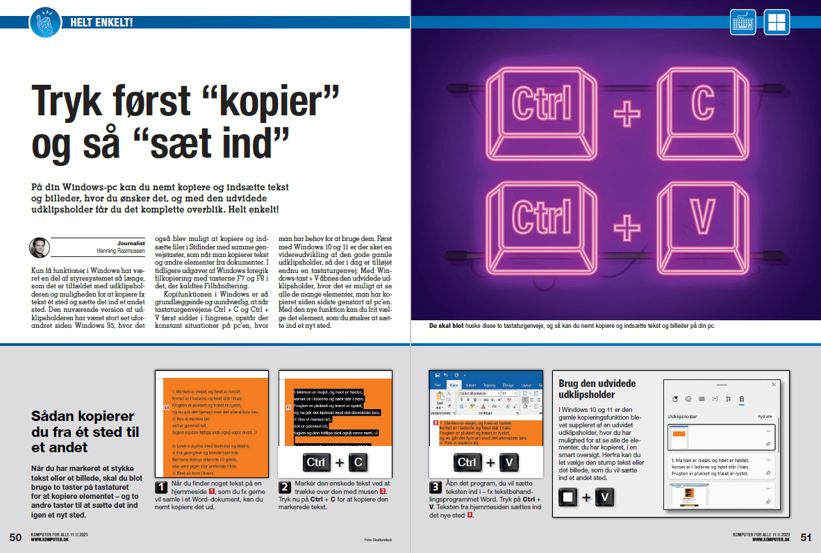 I tidligere udgaver af Windows foregik filkopiering med tasterne F7 og F8 i det, der kaldtes Filhåndtering. Kopifunktionen i Windows er så grundlæggende og uundværlig, at når tastaturgenvejene Ctrl + C og Ctrl + V først sidder i fingrene, opstår der konstant situationer på pc’en, hvor man har behov for at bruge dem. Først med Windows 10 og 11 er der sket en videreudvikling af den gode gamle udklipsholder, så der i dag er tilføjet endnu en tastaturgenvej: Med Windows- tast + V åbnes den udvidede udklipsholder, hvor det er muligt at se alle de mange elementer, man har kopieret siden sidste genstart af pc’en.