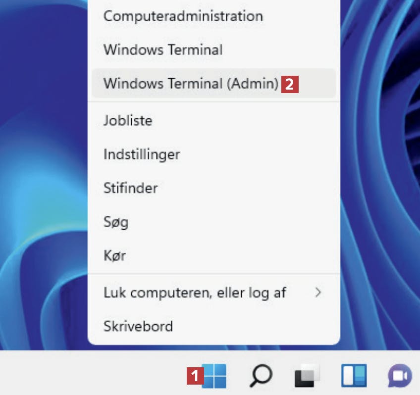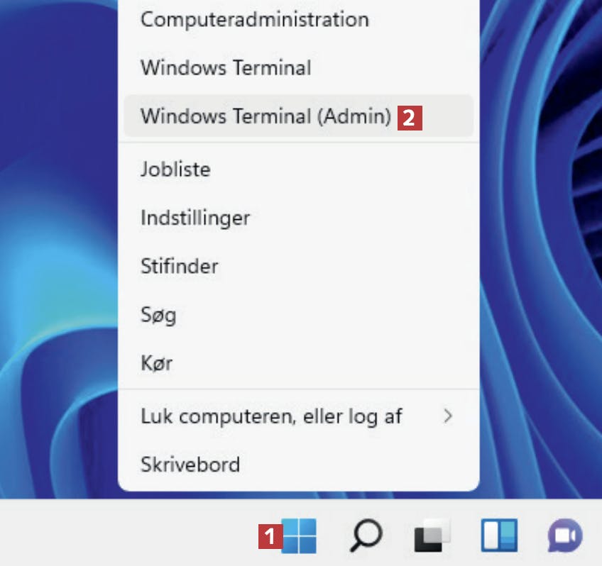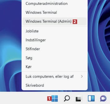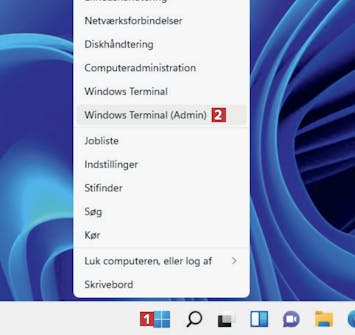 Højreklik på startknappen 1, og vælg Windows Terminal (Admin) 2. I Windows 10 skal du vælge Windows PowerShell (admin), når du højreklikker på startknappen.
