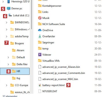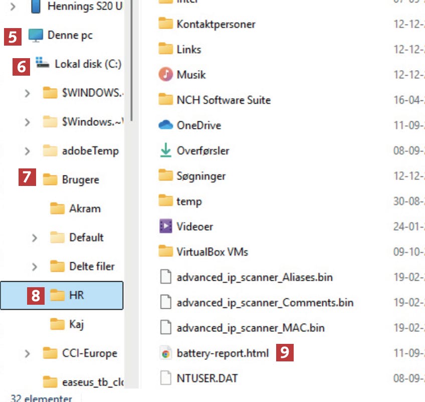 Åbn Stifinder. Klik på Denne pc 5, Local disk (C:) 6, Brugere 7 og dit brugernavn 8. Dobbeltklik på filen battery-report.html 9.