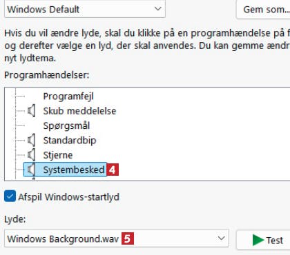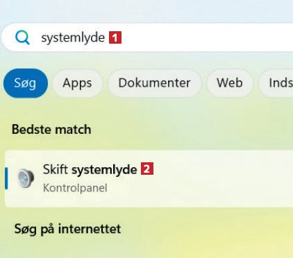 Brug søgefunktionen i Windows til at søge efter ordet systemlyde 1, og klik så på Skift systemlyde 2.