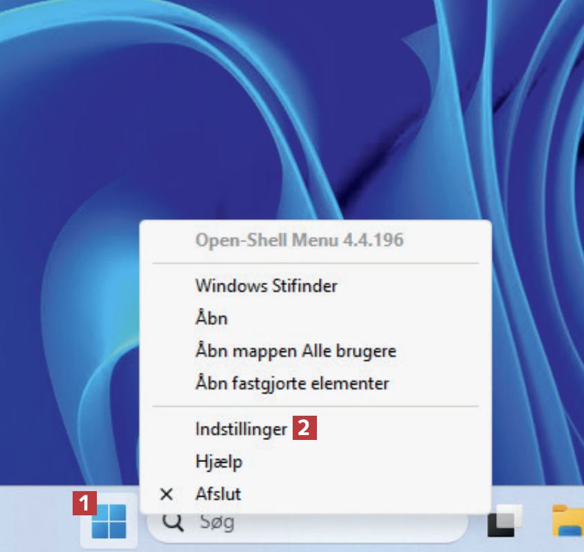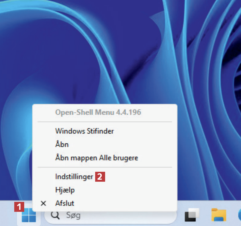Hent Open Shell fra komputer.dk, og installer programmet. Højreklik på startknappen 1 i proceslinjen. Du ser nu en anden højreklikmenu, end du plejer. Vælg Indstillinger 2.