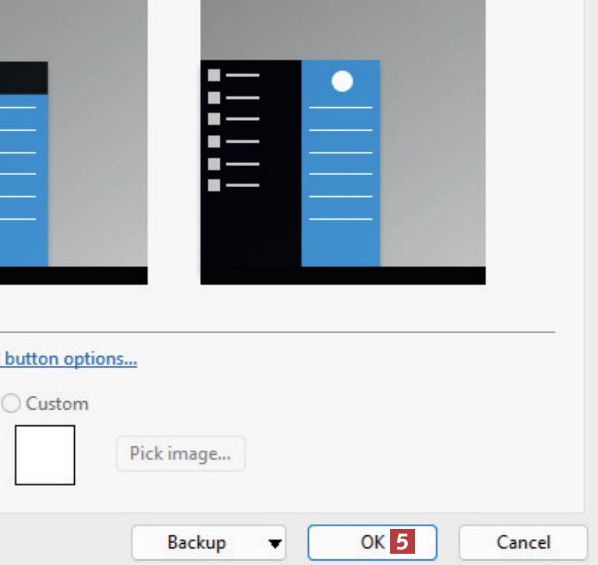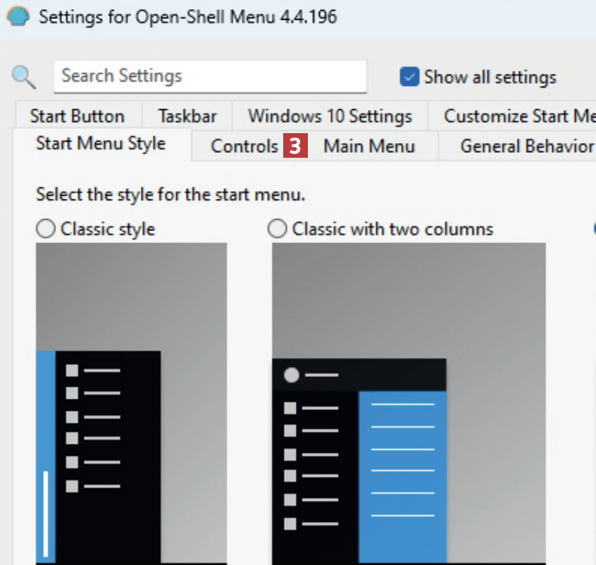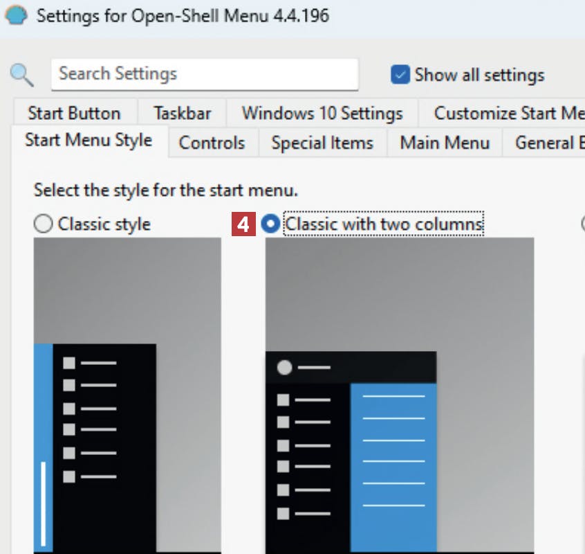 Vælg mellem de tre startmenuer. Vi vælger her menuen med navnet Classic with two columns. Klik i cirklen 4 ved menuen, så den bliver markeret.