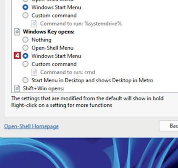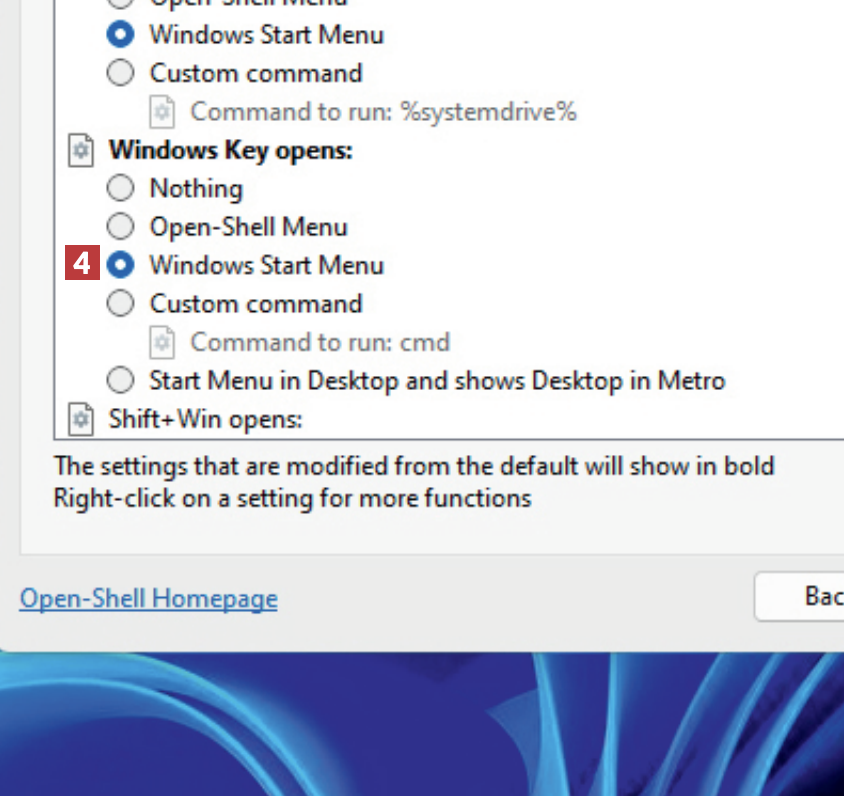 Rul ned til punktet Windows Key opens, og klik i cirklen 4 ud for Windows Start Menu, så der kommer en markering.