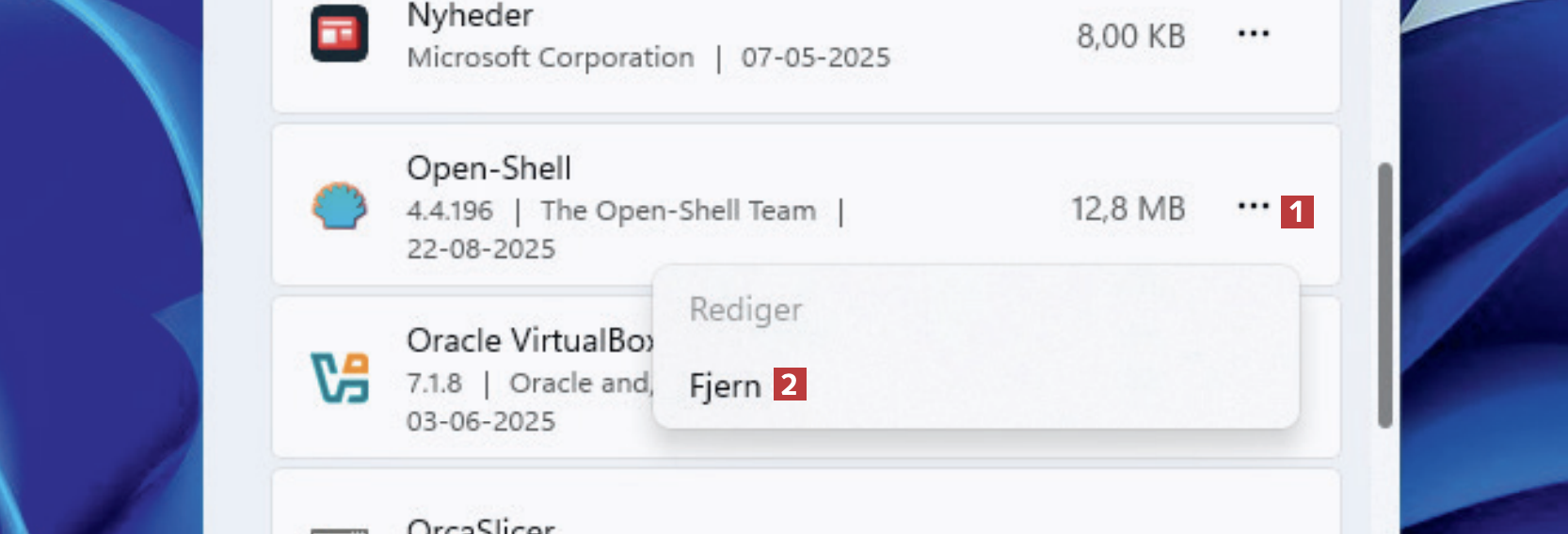 I Windows’ søgefelt skriver du Tilføj eller fjern programmer og trykker på Enter. Du har dermed åbnet Windows-værktøjet, der kan fjerne programmer fra pc’en. Rul ned til Open-Shell, og klik på de tre prikker 1 ud for navnet. Klik på Fjern 2 efterfulgt af Fjern igen i det vindue, der åbner. Følg den afinstallationsguide, der åbner. Så fjernes Open Shell.