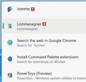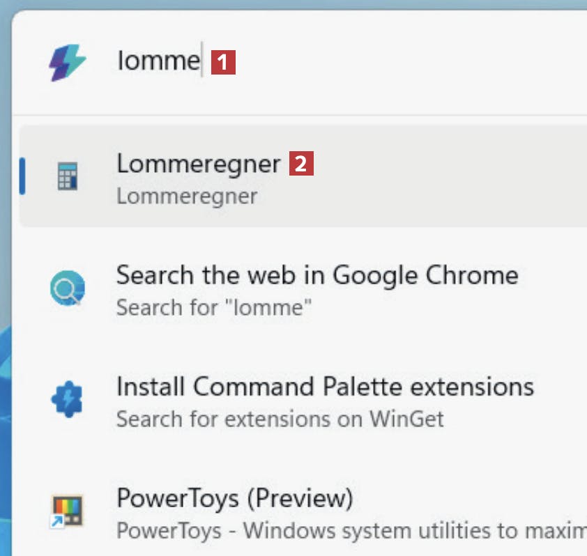 Skriv det, du vil søge efter, som fx lomme 1 for at åbne værktøjet Lommeregner 2. Brug Entertasten for at åbne programmet, eller tryk på Esc-tasten for at rydde feltet.