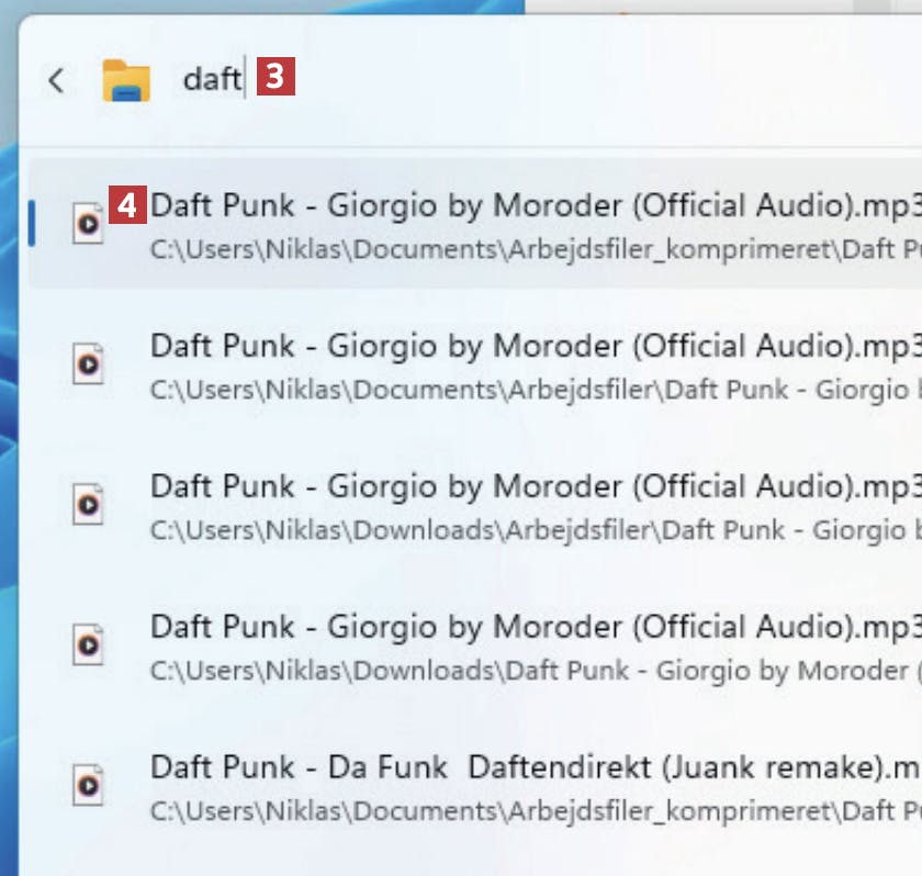 Vil du søge efter en fil på din pc, skal du begynde at skrive navnet på filnavnet, som fx daft 3, som her finder sange fra bandet Daft Punk 4.
