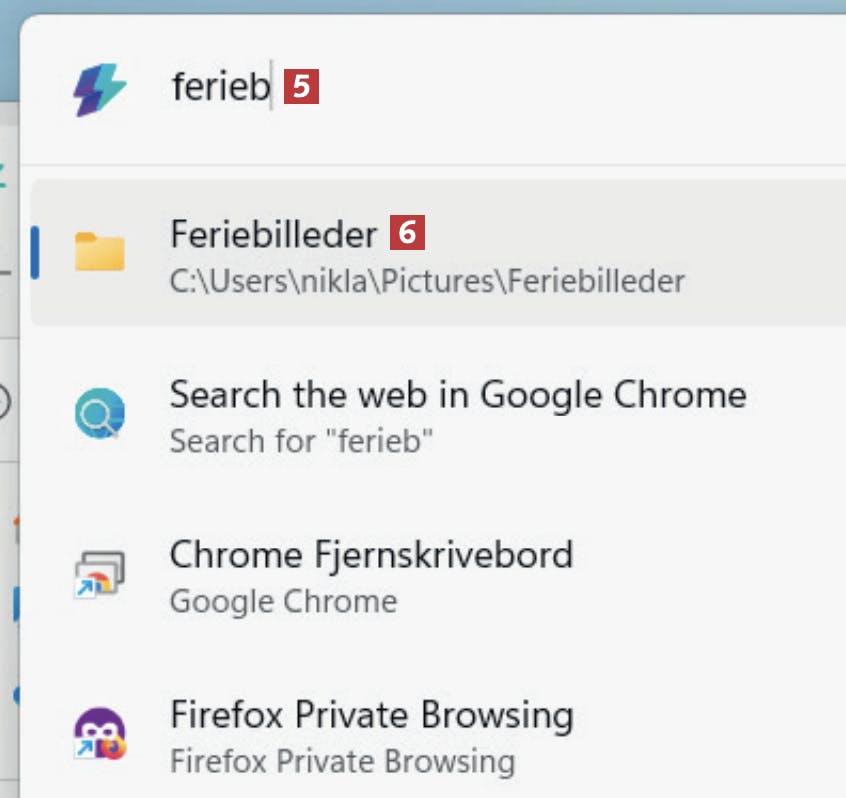 Du kan også søge efter mapper med Command Palette, og fx skrive ferieb 5 for at finde mappen Feriebilleder 6.