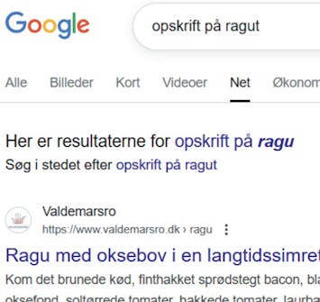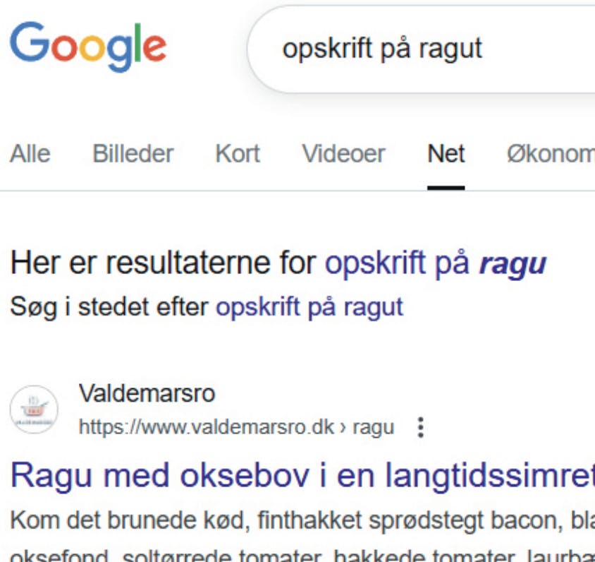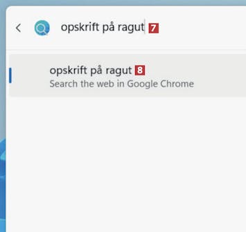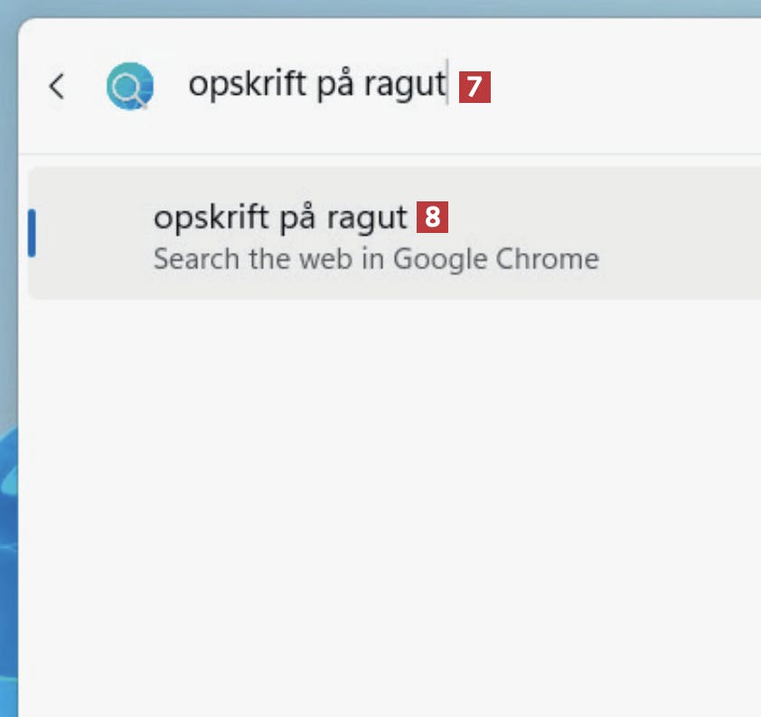 Vil du lave et websøgning efter noget, skal du skrive ?? i søgefeltet. Når det er gjort, vil du se et søgeikon 7. Skriv det, du vil søge efter, fx opskrift på ragut 8 og tryk Enter.