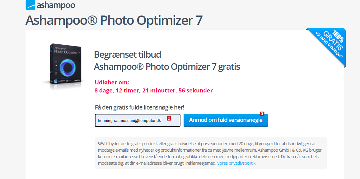 Du skal hente, installere og registrere Ashampoo Photo Optimizer 7 senest den 9/1-2022. Herefter har du adgang til den komplette udgave af programmet til evig tid.