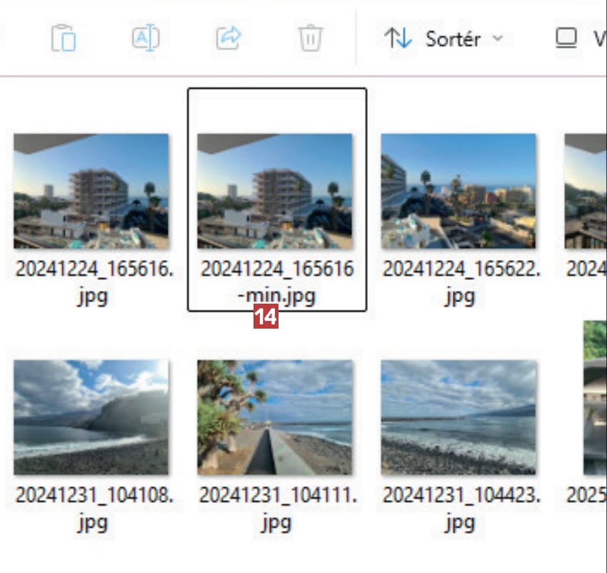 Nu åbner en visning, hvor det originale 11 og det komprimerede 12 billede er sat side om side. Du kan nu trække i skydelinjen 13 for at sammenligne billederne.