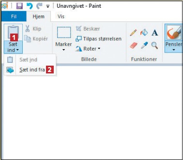 Åbn programmet ved at skrive Paint i Windows’ søgefelt og klikke på Paint. Vælg nu Sæt ind 1 fulgt af Sæt ind fra 2 .