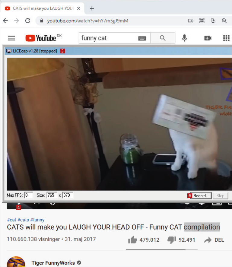 Efter tre sekunder starter optagelsen. Afspil YouTube-videoen, og vælg Stop 8, når klippet er færdigt. Filen gemmes nu det sted, du valgte.