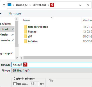 Før optagelsen går i gang, skal filen forhåndsgemmes. Find en placering 6 på pc’en, giv GIF’en et navn 7, og klik på Gem.