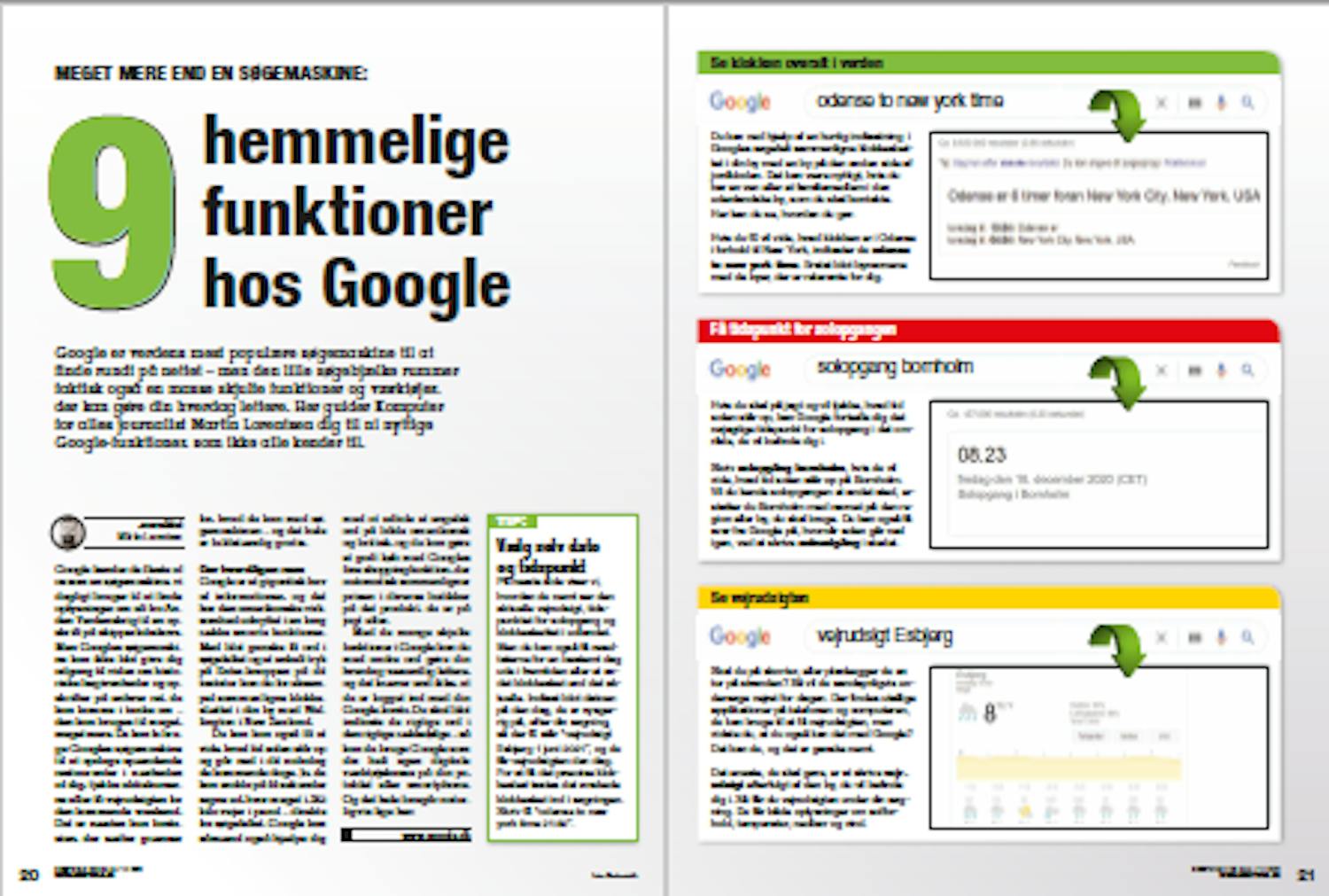 Med de mange skjulte funktioner i Google kan du med andre ord gøre din hverdag væsentlig lettere, og det kræver end ikke, at du er logget ind med din Google-konto. Du skal blot indtaste de rigtige ord i den rigtige rækkefølge – så kan du bruge Google som din helt egen digitale værktøjskasse på din pc, tablet eller smartphone. Og det hele foregår naturligvis lige her: www.google.dk
