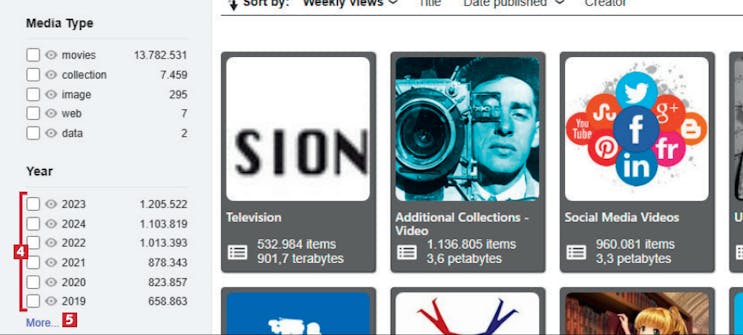 Du kan tilføje filtre på din søgning og fx søge efter udgivelsesår 4. Klik på More… 5 for at se flere årstal. Når du har valgt et filter, bliver oversigten med resultater straks opdateret, og du kan klikke dig igennem de mange film og videoer. Klikker du på en video, åbner et vindue, hvorfra du kan afspille videoen.