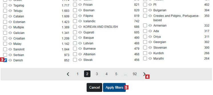 Sæt flueben ved Danish 3. Sprogene er sorteret efter, hvor meget materiale af den valgte indholdstype, der findes på hvert sprog. Nogle gange kan det derfor være nødvendigt at bruge pilene 4 for at finde frem til det ønskede sprog. Her er der fx 852 videoer på dansk, så du skal hen til side to for at finde sproget. Klik på Apply filters 5, når du har valgt sprog.