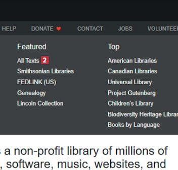 Til at begynde med skal du åbne din browser og besøge hjemmesiden archive.org. I værktøjslinjen øverst vælger du Texts 1.