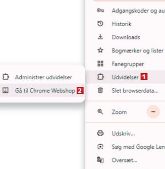 Klik på de tre prikker i øverste højre hjørne af Chrome. Vælg Udvidelser 1, og vælg så Gå til Chrome Webshop 2.